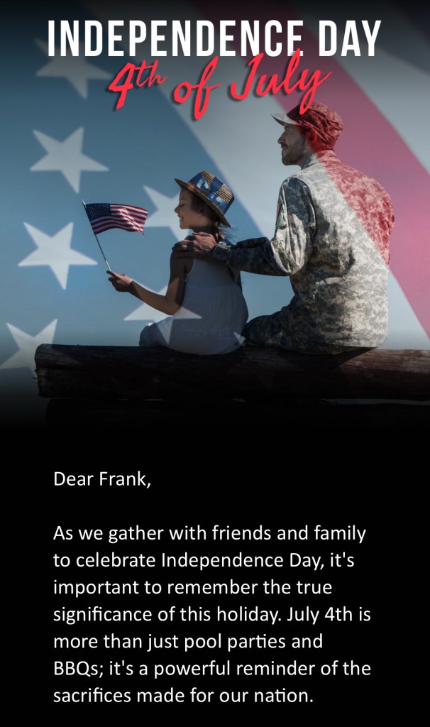 4th of July is a significant opportunity to connect with customers of Til Valhalla Project and remind them how their support helps honor fallen military & first responders. I wrote this email on behalf of the company’s founder. (Note: The email was designed by an outside agency but the body copy is mine.)